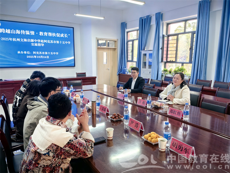 中国教育在线浙江站讯(通讯员 胡洁)教育无界,山海有情。近日,杭州市文海启源中学校长丁荣森一行四人,跨越千里赴阿克苏市第十五中学,开展“教育交流共建”活动,并看望在此援疆支教的胡勇军老师。此次活动以优质课堂示范、教学经验互鉴为纽带,为两地教育搭建起协同共进的桥梁,用实际行动践行深化教育协作、共促发展的初心。
