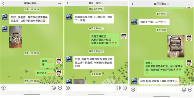 谈及这场“环保接力”,张老师满是感慨:“看到小瞿抱着牛奶盒来学校,我特别感动。他用实际行动给新生上了生动一课,这种‘学长传帮带’比说教更有感染力,也让回收传统更有温度。”而毕业回来的小瞿更是在这样的环境中养成习惯的。“刚进校时,老师就说回收一个牛奶盒能节约不少资源。”从此,他每天整理家中牛奶盒,毕业后仍保持习惯,“看到牛奶盒,就不自觉想整理好”。这一习惯还延伸到生活中,随手关灯、节约用水成了他的常态。