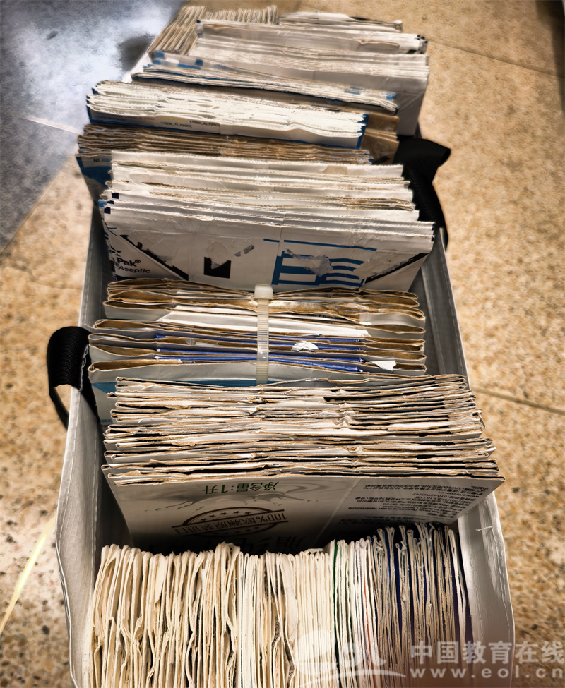 很少有人知道,这批牛奶盒是已毕业的学长小瞿专程送来的。“小学时跟着老师回收牛奶盒,这个习惯一直没改。” 小瞿利用周末整理好家中牛奶盒,“想让学弟学妹直观学回收,也把学校传统传下去。”