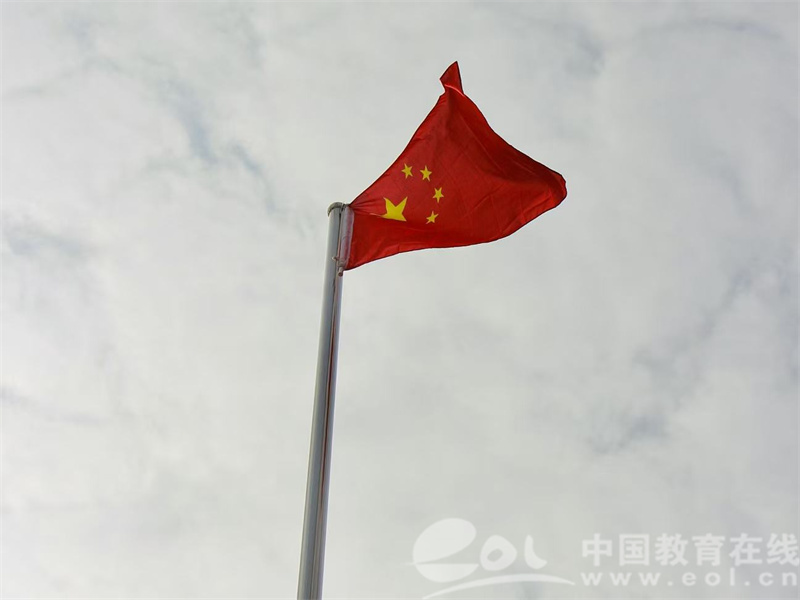 重新飘扬的国旗在空中迎风招展。这面被“卡住”的国旗,最终在师生的坚持、消防员的守护下,以最鲜艳的姿态回到了天空。