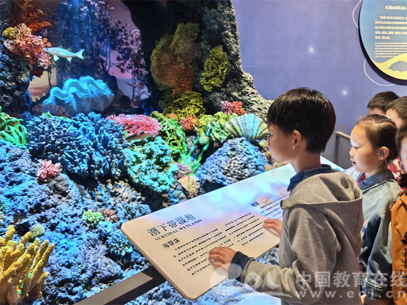 一楼的湿地万象厅也是“自然课堂”。近500件动物标本让孩子们大开眼界。在鸟类迁徙图前,孩子们沿着路线比划,想象着鸟儿南飞的模样。最热闹的当属活体两栖爬行动物区,小乌龟慢悠悠地爬行、小蜥蜴在树枝上张望。孩子们纷纷驻足,小心翼翼地观察,生怕惊扰了这些小生命。“穿越红树林”的模拟装置里,孩子们钻进“树洞”,触摸着仿真的湿地植物,“闻起来香香的!”湿地植物嗅觉体验区里,阵阵惊叹声不断。