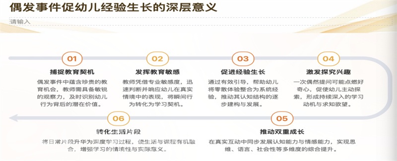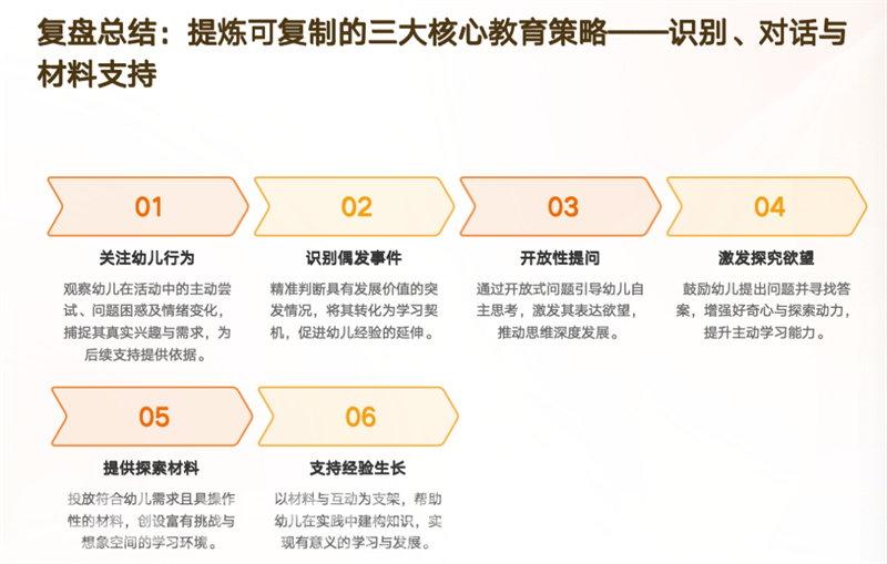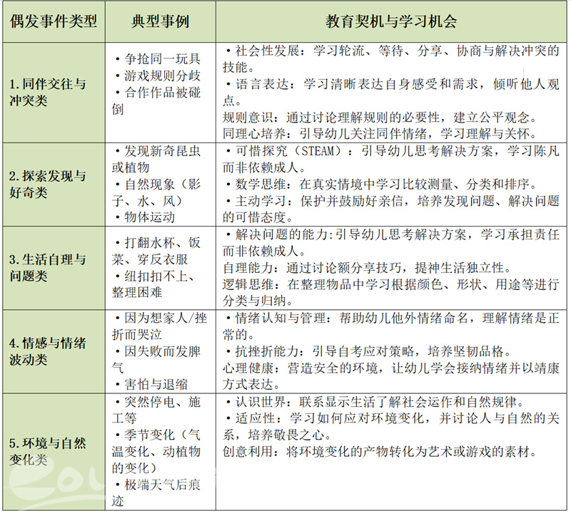 识别策略:关注幼儿的主动尝试、问题困惑、情绪变化等,优先选择能激发幼儿自主性、关联多领域发展的偶发事件。
