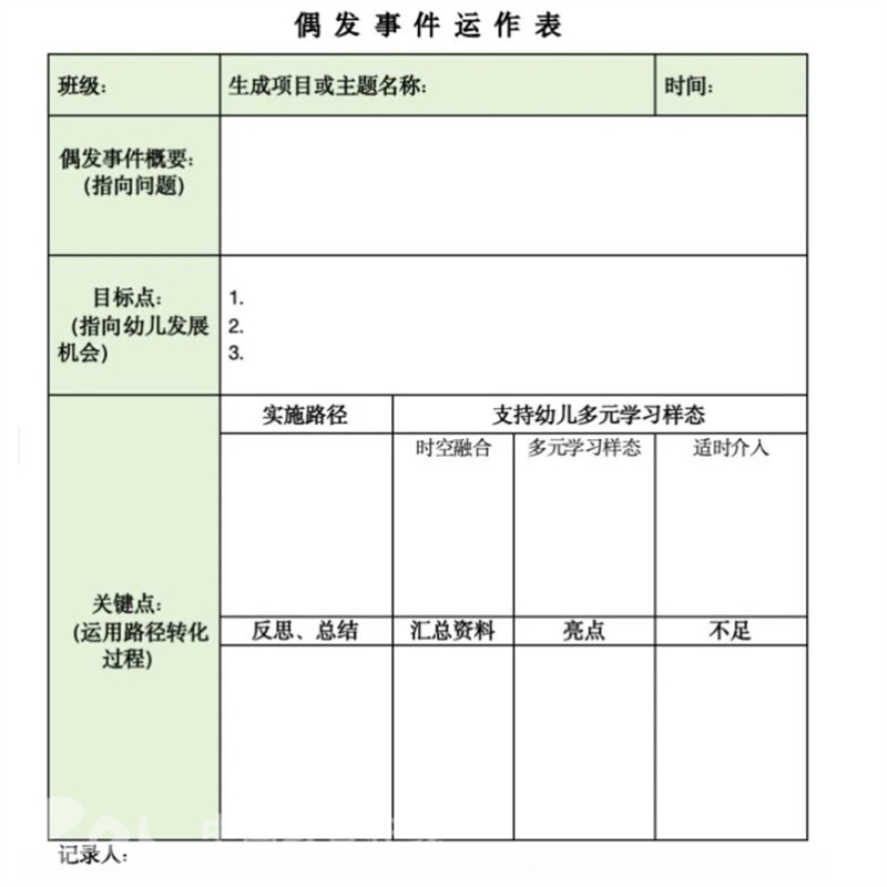 活动开始前,汪老师们向老师们详细讲解“双表”的使用方法“偶发事件识别表”用于初步判断事件类型,如同伴交往与冲突类、探索发现与好奇类等五种类型的教育契机与学习机会,避免错过有意义的教育契机:偶发事件运作表则聚焦后续转化——明确事件对应的教育目标、选择合适的教育策略,如对话引导、材料支持、同伴互助,并梳理出具体的实施路径。