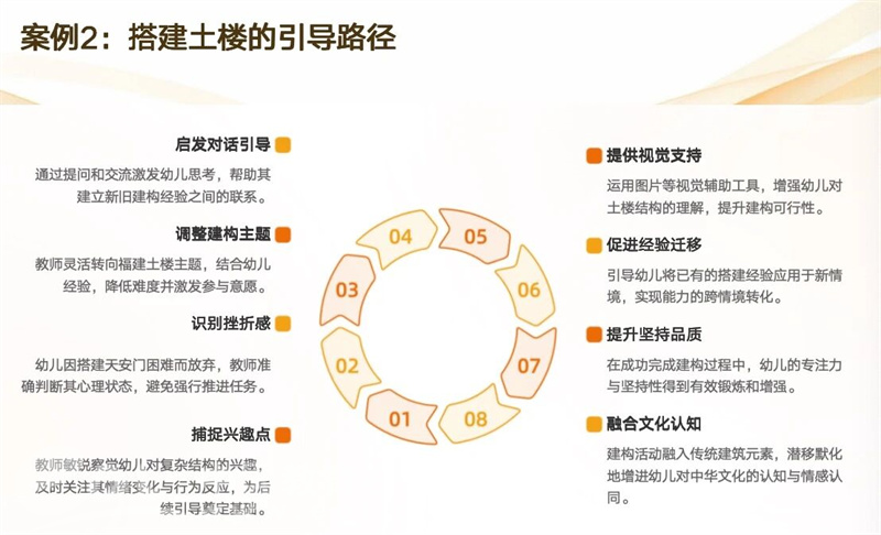 案例2:土楼搭建幼儿搭天安门因复杂放弃,教师未直接干预,以“土楼与天安门结构是否一样”提问引导,提供土楼图片与示意图。幼儿转搭土楼,锻炼空间能力、了解建筑文化,“双表”记录策略为“兴趣引导+材料支持”。