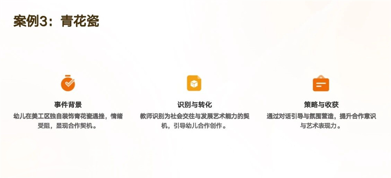 案例3:请你帮帮我幼儿独自装饰青花瓷遇挫,“这个图案太难画了,我画不好。”“我来帮你画。”幼儿转向合作创作完成作品,事件被“识别表”定为“社会交往+艺术能力类”,策略为“对话引导互助”,培养合作意识与同理心。