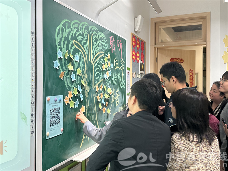 教室里,家长们俯身于孩子的画作前,在孩子的“生命成长树”上添上点滴印记。有位爸爸在代表孩子“3岁”的树枝旁写下“第一次自己吃饭,你举着勺子笑了好久”;有位妈妈读完孩子“你多陪陪我吧”的便利贴后,在回应贴上郑重写下:“植物园这周有菊花展,我们一起去看吧!”……这些细腻的话语,让抽象的爱变得具体而深刻。