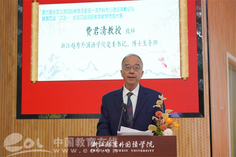 开幕式上,浙江越秀外国语学院党委书记费君清教授致欢迎辞,他介绍了绍兴地域文化特色与学校办学成果。