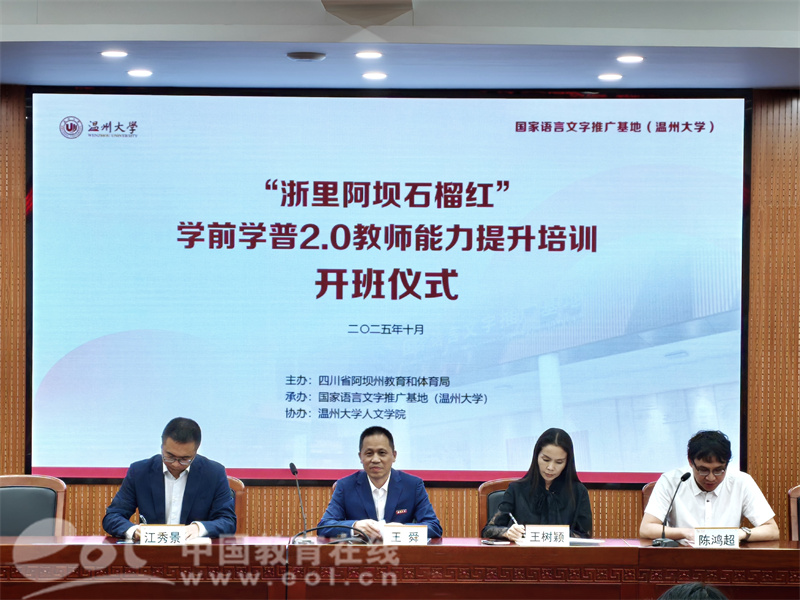 王舜代表温州大学向全体学员表示欢迎。他指出,国家语言文字推广基地(温州大学)在2024-2025年连续承办教育部对口支援西藏、新疆等地国家通用语言文字能力提升培训项目,助力民族地区教师提高普通话水平。本次培训精心设置语音基础、课堂实训、跟岗学习等课程,旨在依托“浙里阿坝石榴红”品牌,促进教育发展和民族团结。