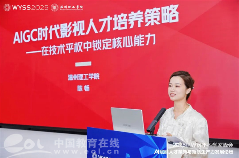 中国教育在线浙江站讯(记者 陈显婷 通讯员 温理萱)近日,在2025世界青年科学家峰会AI赋能人才革新与新质生产力发展论坛上,温州理工学院文学与传媒学院教师陈畅作为学校唯一代表参加影音分论坛并作主题演讲,分享AIGC时代影视人才培养的“温州方案”,引发行业广泛关注。这位被师生亲切称为“AI姐”的青年教师,正以技术、艺术、教育深度融合的创新实践,领跑AI影视教育与文化传播新赛道。
