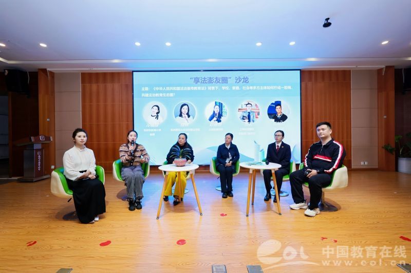 在合唱团《法治歌》的动人旋律后,“享法澎友圈”圆桌沙龙将活动推向高潮。本次沙龙的主题是 :“新法背景下,学校、家庭、社会等多方主体如何拧成一股绳,共建法治教育生态圈?”现场连线了华东师范大学任海涛教授。任教授参与了编写,他从自身角度出发,具体分享了这部法律如何为孩子们护航。此外,学校、家庭、社会代表齐聚一堂,分别从不同维度,共同探讨如何构建法治教育生态圈。