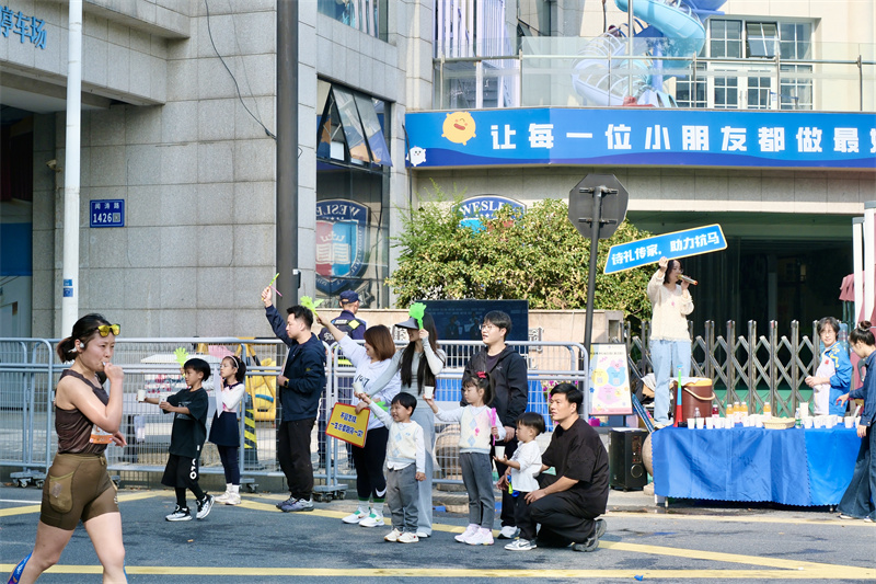 在数万名跑者之中,一群身穿统一服装的“志愿者”格外引人注目——来自唯诗礼幼儿园的孩子与家长,在赛事设立的“萌力补给站”中递水、呐喊、举牌,用稚嫩却响亮的声音为选手注入坚持的勇气。