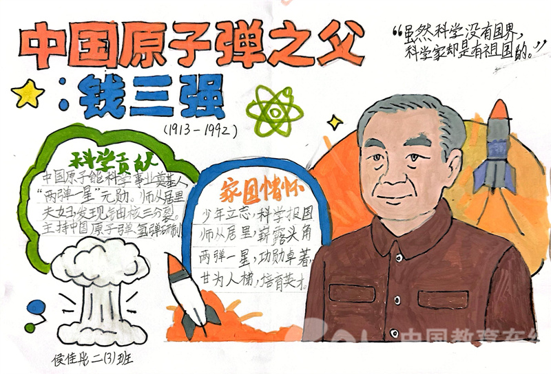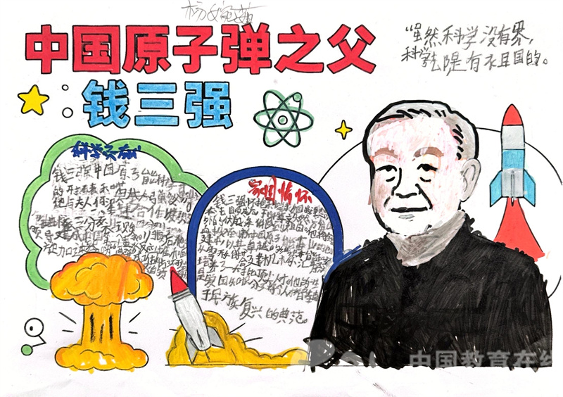 一场“追光之旅”,结出了满程的成长果实。孩子们结合自己的特长,把对钱三强爷爷的敬意变成了看得见的作品:有的用画笔描绘“钱爷爷搞科研”的场景,色彩里满是崇拜;有的制作手抄报,工整地写下“两弹一星”精神……这些充满童真与诚意的作品,正等待着大家一起欣赏——每一份成果,都是孩子们向榜样致敬的小小决心。