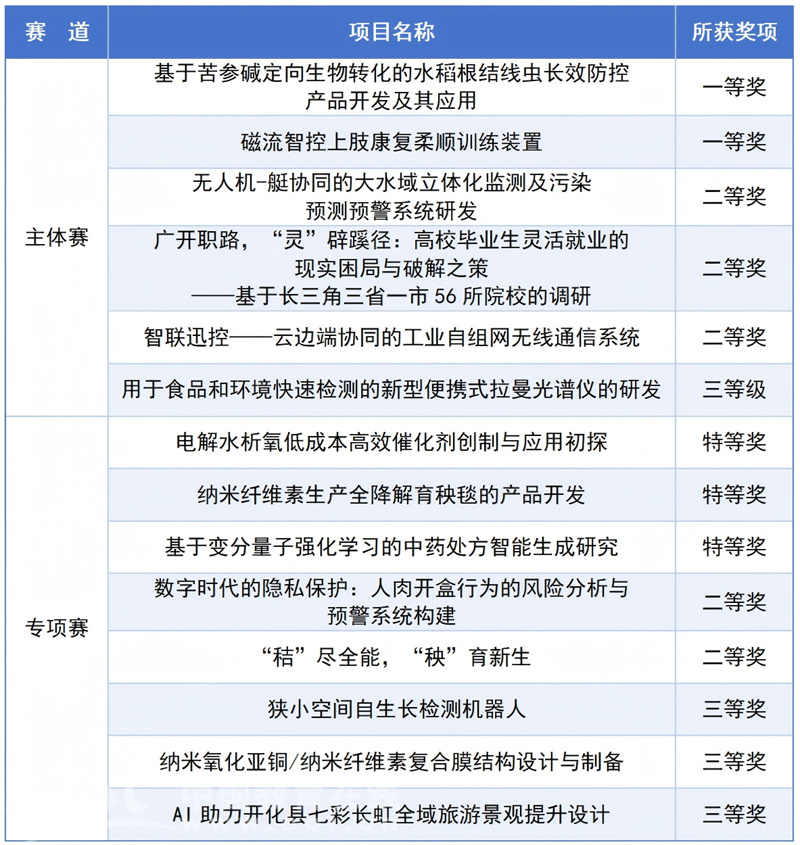 经过激烈角逐,嘉兴大学在主体赛中荣获一等奖2项、二等奖3项、三等奖1项;在专项赛中荣获特等奖3项、二等奖2项、三等奖3项,展现了学校在科技创新领域的强劲实力。