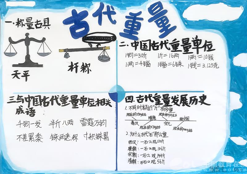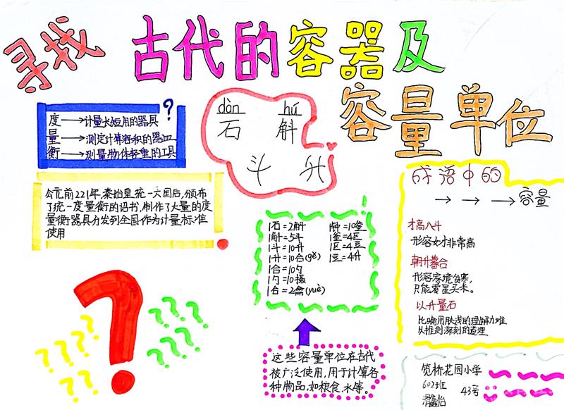 五、六年级共同追溯“度量衡”历史。通过多样学习了解古今重量、容量单位差异,制作学习小报并在班级展示介绍,不仅明晰了“衡”、“量”的发展,更在感悟古人智慧中生出民族自豪感。