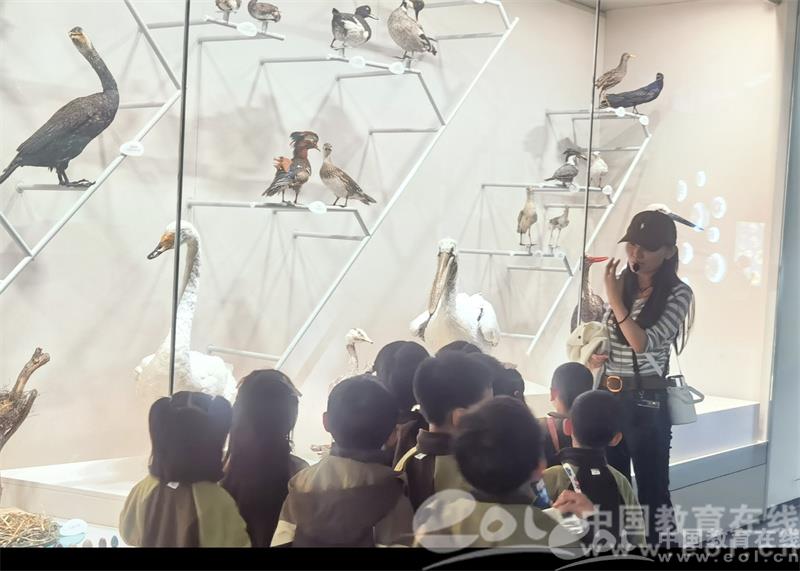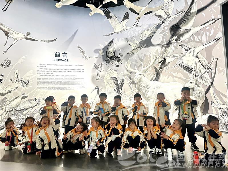 带着自制研学卡,小探险家们走进了中国湿地博物馆。“快看,弹涂鱼!”“白鹭的羽毛好漂亮!”孩子们在栩栩如生的湿地景观前流连忘返,认识了水黾、河狸、丹顶鹤等湿地“原住民”。通过老师生动的讲解,孩子们了解到湿地有上百种鸟,有会游泳的水鸟、涉水觅食的涉禽,有的鸟儿是空中猎手、是健走者、是攀援高手、是天生歌手。老师告诉孩子“为什么有的嘴长、有的脚长”。