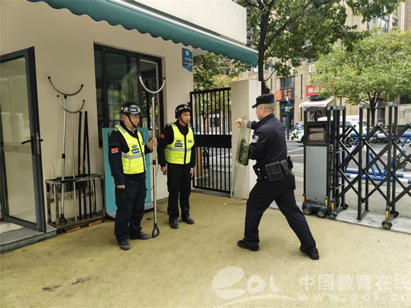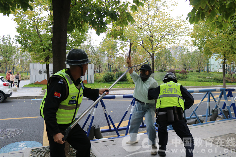上午十时,孩子们正在操场上玩游戏,突然,一名“歹徒”在门口试图强行闯入幼儿园的大门。保安立即进入战斗准备,拿出防暴工具,拉紧急报警铃,并向园区园长、主任报告。