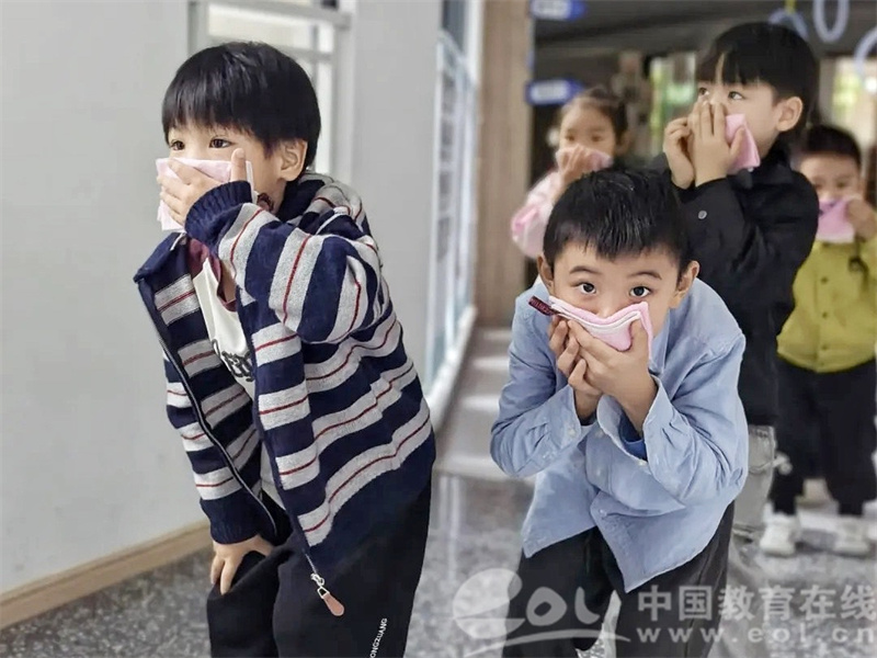 知识记心间,更要践于行。随着急促的警报声响起,消防应急演练正式启动。警报响起后,各班幼儿在老师的指引下,迅速用湿毛巾捂住口鼻,弯腰低姿,按预定路线冷静、快速地向安全地带疏散。演练中,教师们分工明确,前后守护;各点位负责人沉着指引,确保整个疏散过程忙而不乱、高效有序。