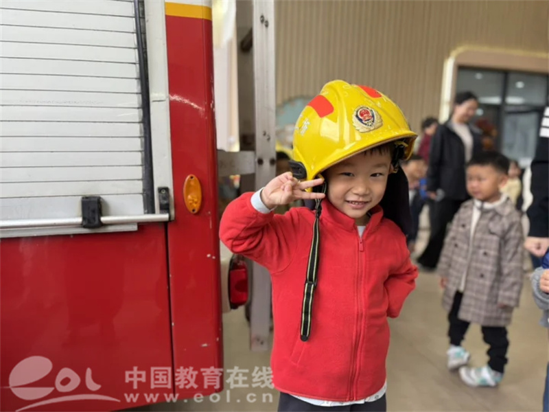 在互动环节,孩子们展现出浓厚的学习兴趣。“这个大水箱能装多少水呀?”面对孩子们充满童趣的提问,消防员耐心解答,并邀请小朋友试戴消防头盔。