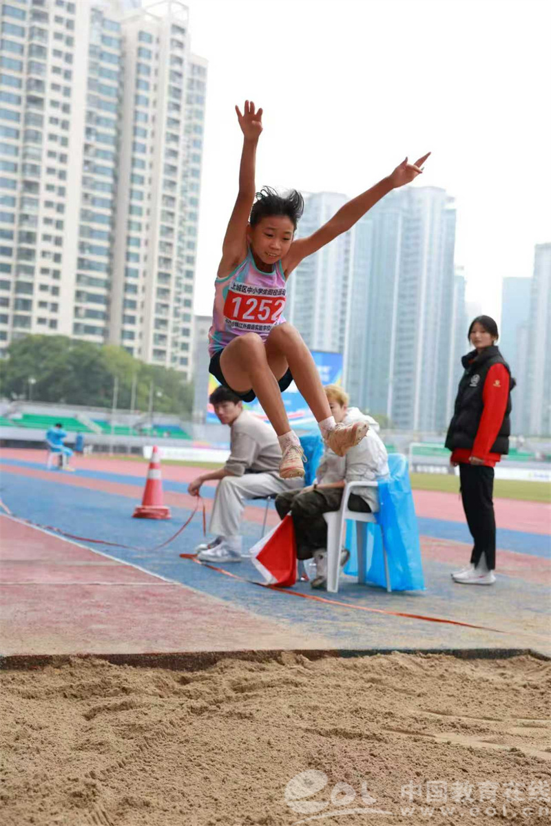 在众多参赛选手中,403班的沈安馨成为一颗耀眼的新星。这位年仅10岁的女孩在跳高赛场展现出超越年龄的沉稳与实力,助跑、起跳、过杆一气呵成,最终以1.38米的优异成绩摘得冠军,并打破了1.37米的赛会纪录。紧接着,她在跳远项目中再度发力,以4.38米的绝对优势蝉联冠军,一人独揽两枚金牌,成为本次赛事的“双冠王”。