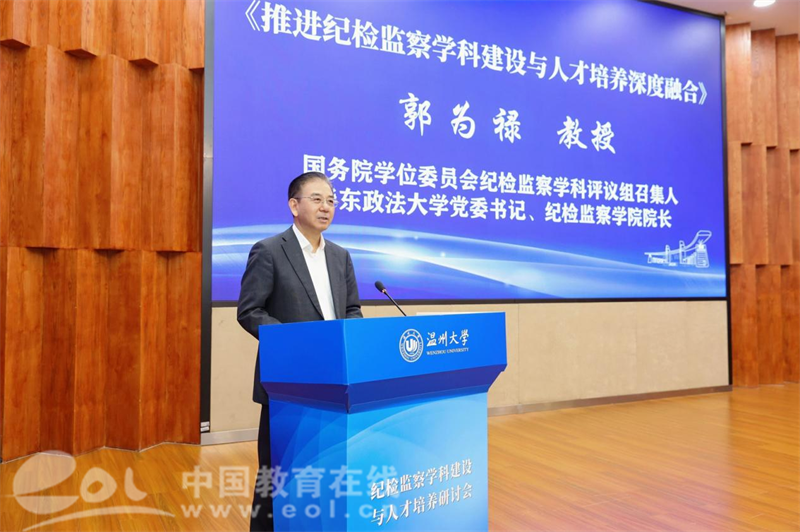 国教育在线浙江站讯 (记者 陈显婷 通讯员 邱书婷)11月8日,由温州大学主办,温州大学法学院、清廉温州建设研究中心承办的“纪检监察学科建设与人才培养研讨会”在温州大学岩松堂召开。国务院学位委员会纪检监察学科评议组召集人、华东政法大学党委书记郭为禄,浙江省教育厅党组成员、省纪委监委驻省教育厅纪检监察组组长、省纪检监察协会副会长王健等百余位专家学者齐聚温州,围绕纪检监察学科与人才培养深度融合展开深入研讨。