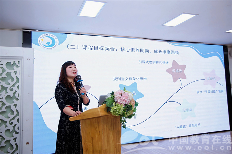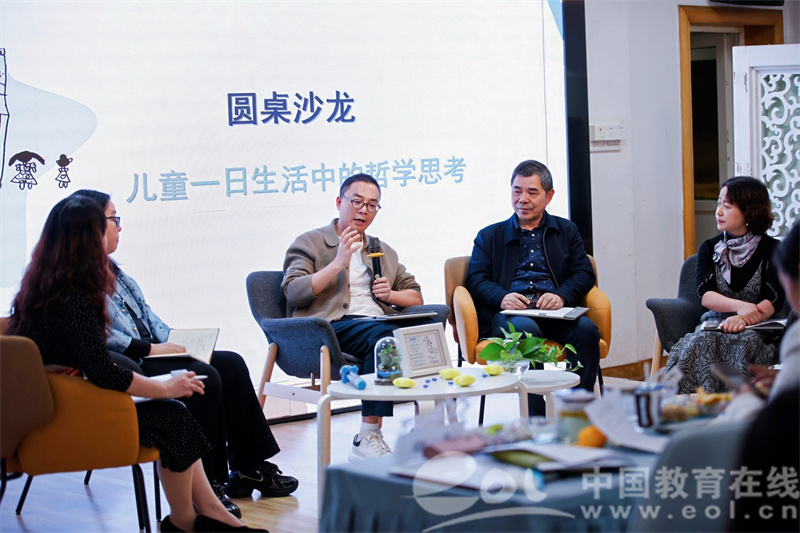 在实践分享环节,星辰幼儿园园长章瑛系统介绍了将“一顿美味大餐”“一个种子包”等生活场景转化为“哲思实践场”的探索路径。张笑言老师讲述了孩子们在孵化芦丁鸡的过程中,面对“帮还是不帮”“占有还是成全”等伦理选择,展现出对生命的尊重与思考。俞敏老师则分享了一个牛奶盒引发的关于“公平”“价值”与“创造”的深度讨论。庄雪妍和周文老师分别从“择豆标准”和“地球减负”等议题出发,呈现了儿童如何从被动接受走向主动建构,逐步形成自己的判断与责任意识。