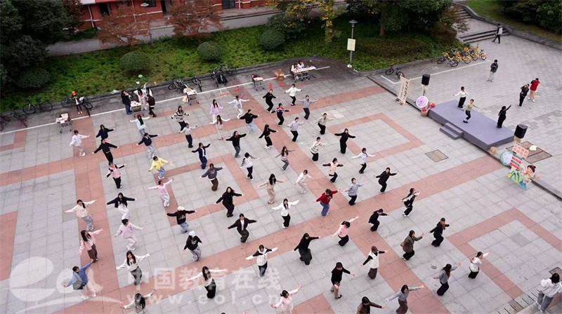 随着《舞韵风华》《燃脂舞韵》《木桥小谣》等古风音乐接连响起,由校艺术团和课程学员带来的快闪表演引来阵阵掌声。随后,在陈乐彦老师的领舞下,上百名学生同时起舞,动作整齐划一,衣袂飘飘,许多原本围观的师生被气氛感染,也自发加入舞动行列。