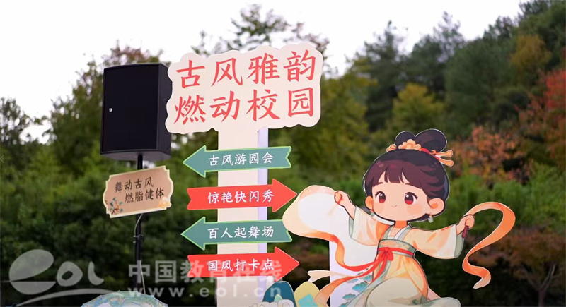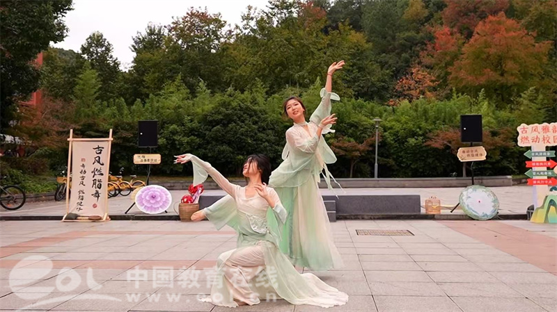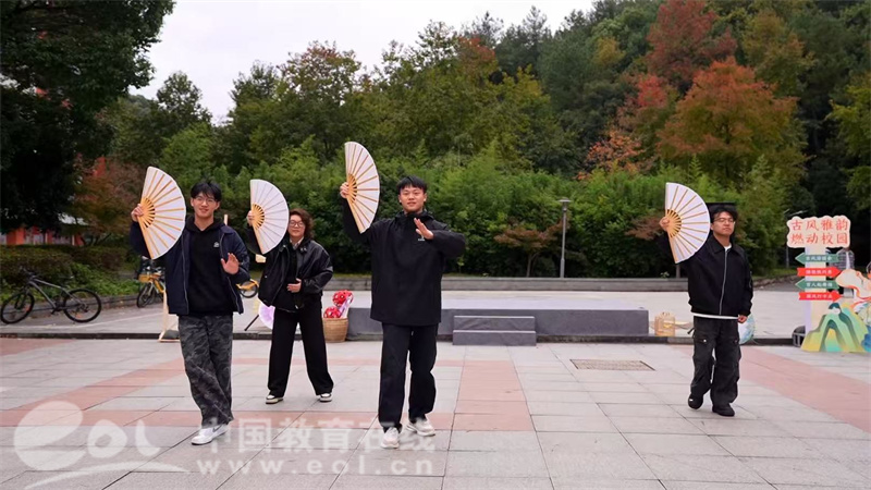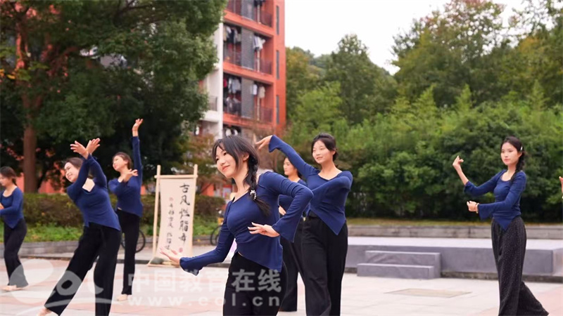 中国教育在线浙江站讯 (记者 陈显婷 通讯员 陈乐彦 鲍炜 张倩)11月12日,浙江工商大学杭州商学院的校园内迎来一场别开生面的沉浸式教学活动。学院美育名师工作室将《古风燃脂舞》课堂从教室搬至胜兰苑广场,开展了一场融合游园、快闪与百人齐舞的“古风雅集”,吸引了众多师生驻足围观,现场人头攒动,欢声笑语不绝于耳。