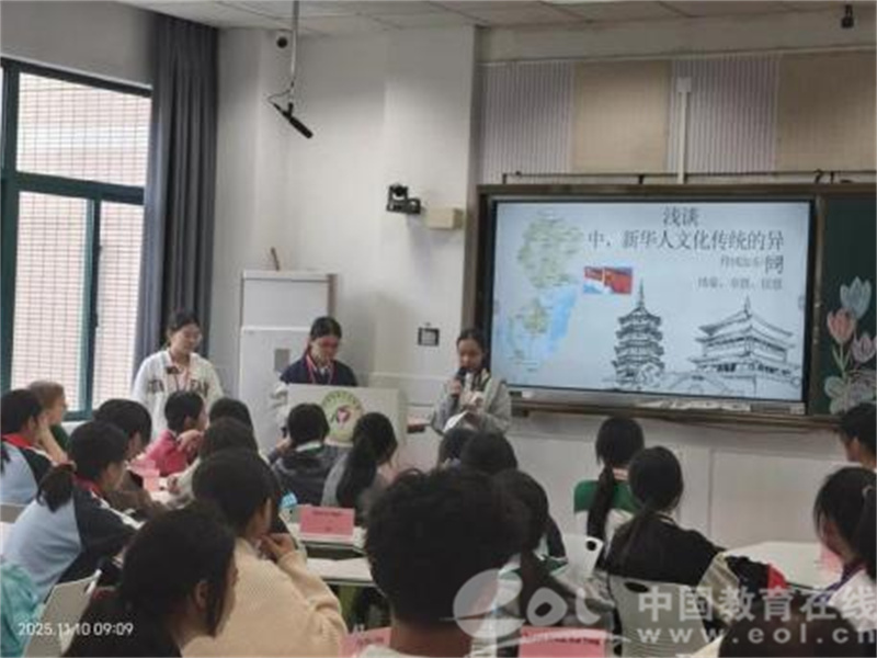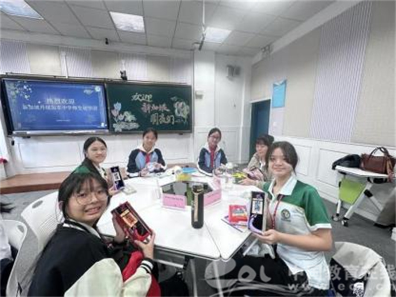 随后,师生代表团齐聚三楼录播教室进行欢迎仪式,仪式由副总校长陆偲佳主持。仪式上,中新师生分享了各自的文化习俗与校园生活,在欢声笑语中拉近距离。结对环节,两校互赠精心准备的纪念礼物,友谊的种子在此播撒。