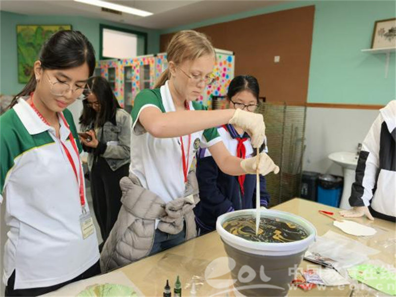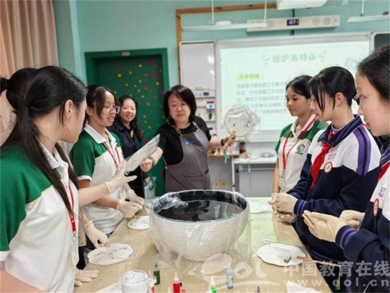 紧接着,艺术组周莹老师为双方师生带来了一堂“非遗漆扇制作”美术体验课。从漆扇的发展历史,到制作工艺和技法材料等,周老师把杭州所代表的江南水乡的诗情画意淋漓尽致地制作到漆扇作品上。新加坡师生共同观看视频,动手制作,在自己创作的漆扇上盖章留念,收获绝无仅有的杭城记忆。