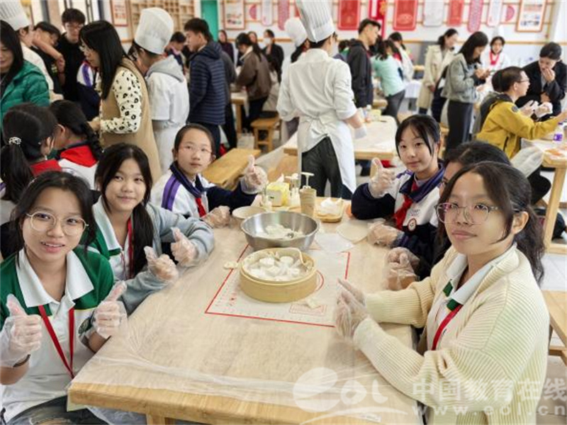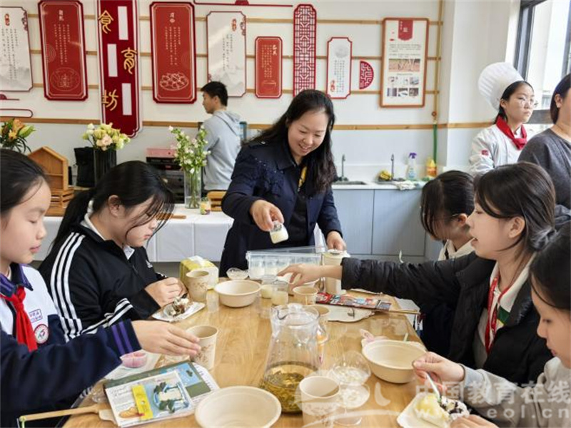 艺术之旅画上句号,美食烘焙拉开序幕。708班刘昶和706班辛若珩两位同学带领新加坡师生认识杭州市花——桂花。他们向友人介绍了杭州的著名赏桂景点,讲解与桂花相关的诗词、典故、成语。此后,两校学生在来自西湖职高的糕点师傅的指导下制作桂花糕点。同学们一边喝着龙井茶一边品尝带有桂花香的酒酿圆子、糯米藕等水果点心,欣赏优美的古筝演奏,教室中充满了桂香与茶香,更洋溢着美好会心的笑容。