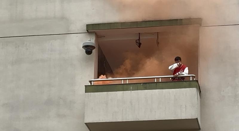 在全体师生安全集结、清点人数后,演练进入核心模拟环节,一场贴近真实火情的应急救援场景随即上演。本次模拟设定为教学楼四层有一名“被困人员”因突发状况未能及时撤离。现场“险情”升级,负责巡查的学校安保人员立刻进入应急状态,第一时间拨通模拟119火警电话,按照规范流程清晰准确地报告“火灾”现场态势、被困人员具体位置及校园详细地址,为后续“救援”争取宝贵时间。
