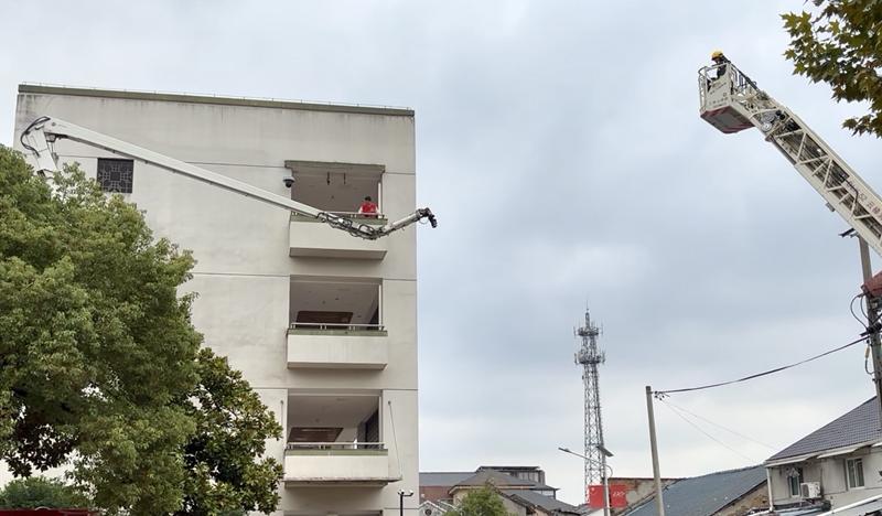 消防车火速驶入校园,身着专业装备的消防员们迅速下车,分工协作、动作娴熟。一组人员快速架设云梯,精准对准四楼“被困人员”所在窗口;另一组人员立即升起高喷水枪,对“起火区域”实施降温灭火。在消防员的专业操作下,“被困人员”被稳稳护送至地面,成功脱险。整个救援过程紧张刺激,让在场师生直观感受到了消防队伍的专业素养与救援速度。