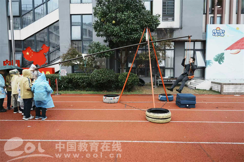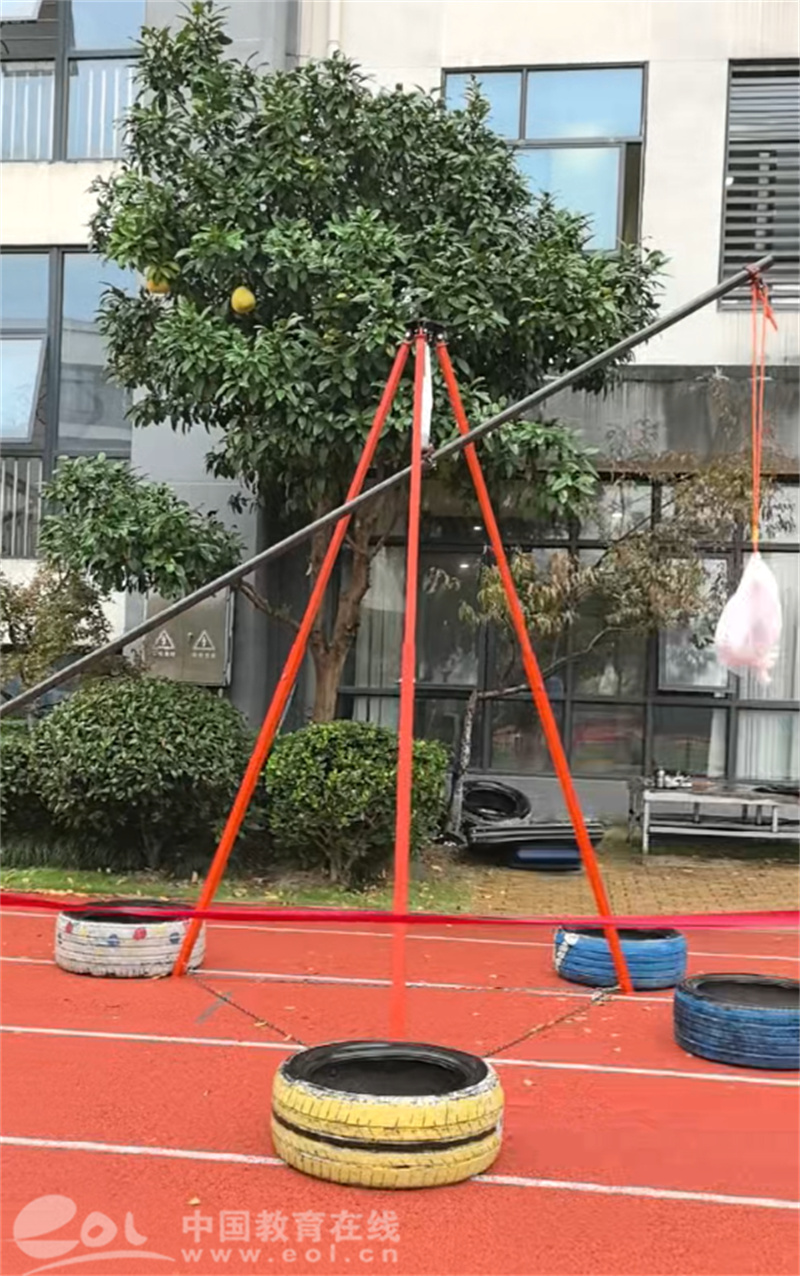 “寻找长达6米的加厚无缝钢管费了不少周折。”锦绣育才附校科学教研组长徐煌说。老师们通过钢管、重型铰链和绳索等物料,仅用半天时间,就组合成了一个稳固的巨型杠杆。