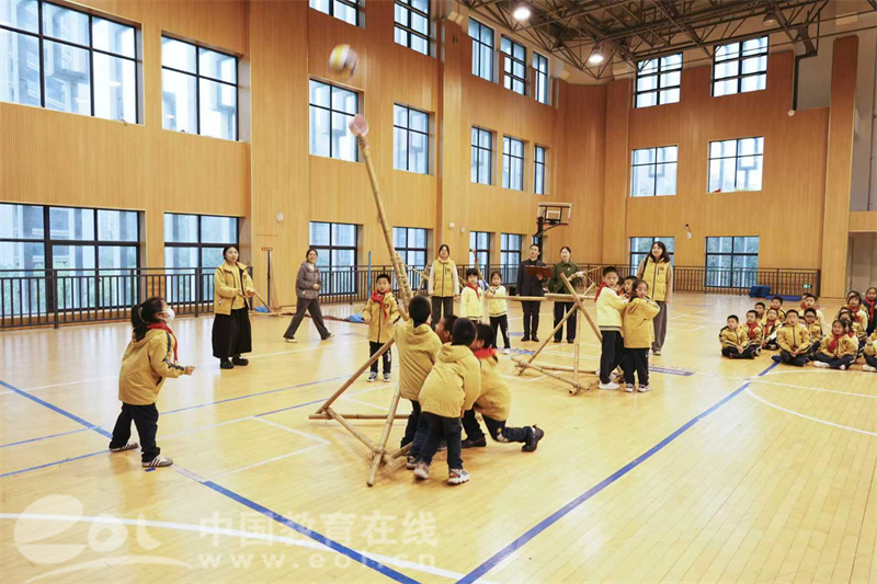 在一二年级的“杠杆挑战区”里,孩子们三五成群,正在用毛竹和麻绳制作杠杆装置。“这里应该当支点!”一个小男孩指着绑麻绳的位置认真地说:“如果距离太近可能撬不动,但太远了可能会翻掉。”