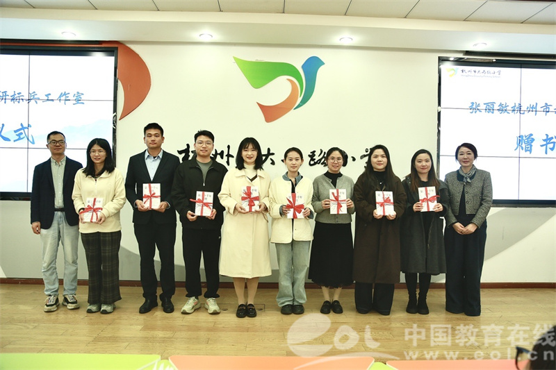 西湖区教育发展研究院研究员陈国民、杭州市科研标兵工作室导师张丽敏为工作室成员赠送教育科研类书籍。一本本厚重的书籍,承载着以书为媒、汲取智慧的期许,也为工作室成员开启了专业成长的新路径。