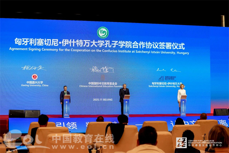 大会期间,举行了匈牙利塞切尼・伊什特万大学孔子学院合作协议签署仪式和授牌仪式。中国国际中文教育基金会理事长杨卫、嘉兴大学校长梅德庆、匈牙利塞切尼・伊什特万大学副校长埃斯特・卢卡奇作为三方代表共同签署《匈牙利塞切尼・伊什特万大学孔子学院合作协议》,杨卫为孔子学院授牌,标志着两校联合申报的“中文+新技术”特色孔子学院成功落地,中匈人文交流再添新纽带。浙江省教育厅副厅长舒培冬、匈牙利内政部公共教育国务秘书佐尔坦・马鲁萨出席并见证授牌仪式。