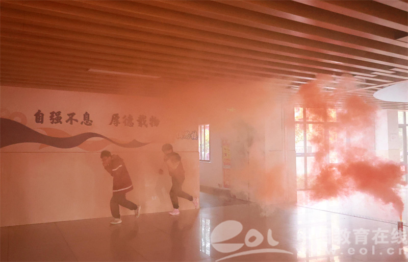 作为本次演练的亮点环节,“消防逃生体验屋”的启用为同学们带来了沉浸式的体验。屋内模拟了充满无害烟雾的黑暗环境,高度还原了真实火场的危急情境。在工作人员的指引下,同学们分批次进入,严格遵循逃生要领,沿安全指示标识快速撤离。这种高度仿真的演练,不仅强化了理论知识的运用,更有效锻炼了在烟雾、黑暗等复杂环境下的心理承受力与现场应变能力。