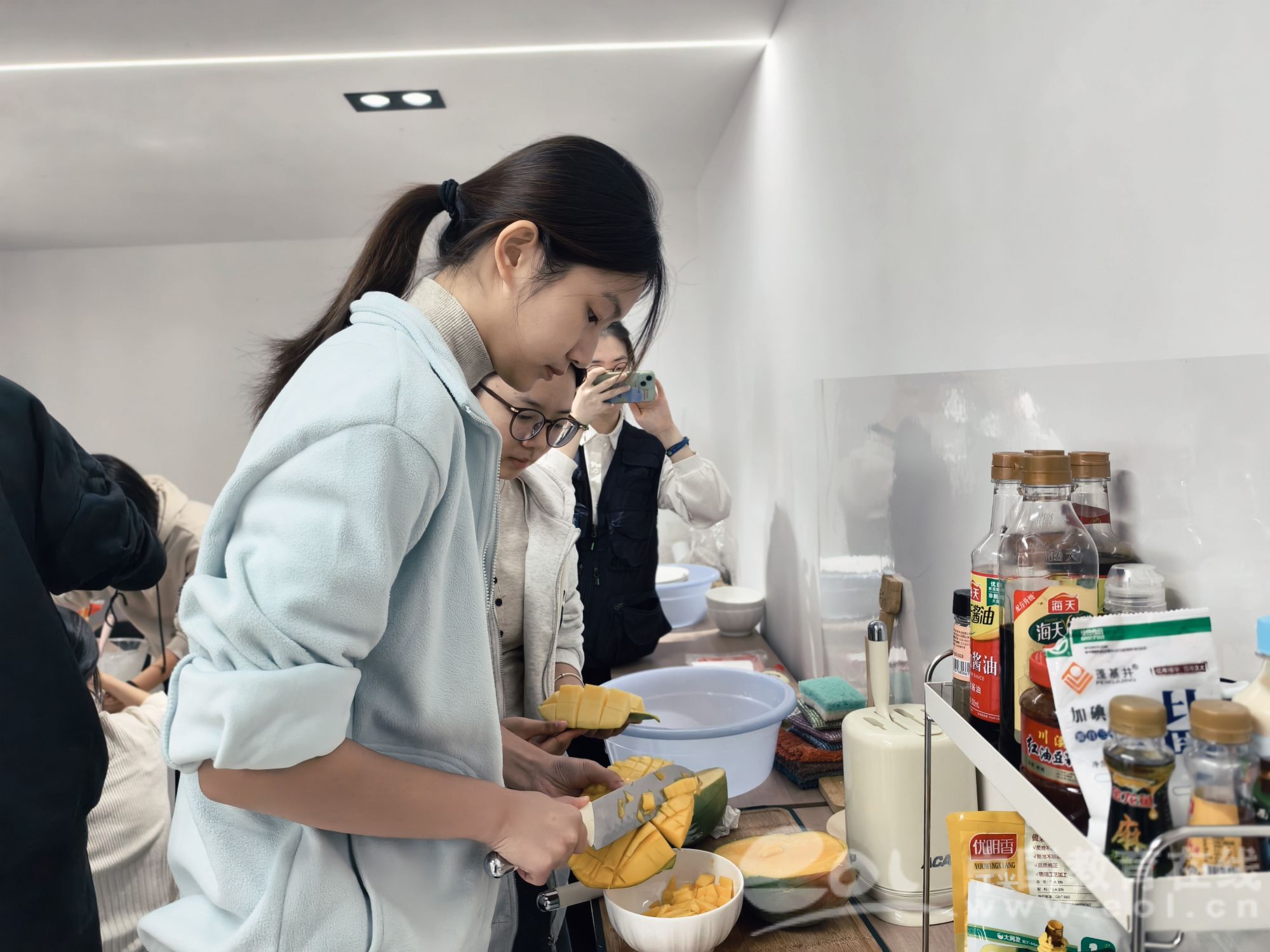 “这是我们第一次用自己摘的桂花做黄油饼干,感觉特别有意义!”国贸专业的大一学生陈妤婕一边说,一边把烤盘从烤箱里取出。她的身旁,几名同学正忙切芒果、搅打奶油、擀糯米皮,灶台上的板栗排骨在锅里咕嘟作响,蒸笼冒着腾腾热气。
