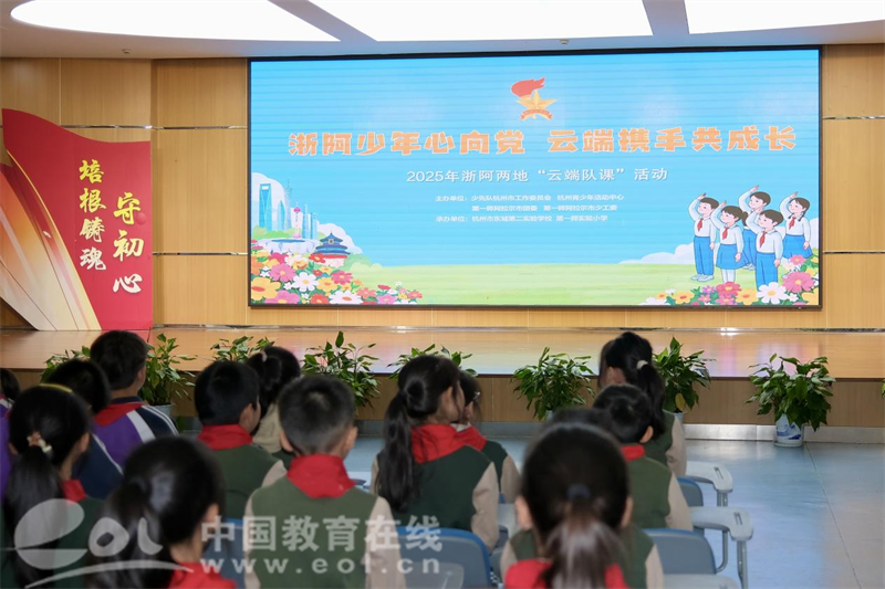 中国教育在线浙江站讯 (记者 陈显婷 通讯员 俞梦婷)11月19日,2025浙阿两地“云端队课”在杭州市东城第二实验学校(杭师大东城中学)成功举办。本次活动由杭州市少工委、杭州青少年活动中心少工委联合第一师阿拉尔市团委、师市少工委共同主办,第一师实验小学与杭州市东城第二实验学校承办,通过线上视频会议系统实现两地少先队员实时互动,以创新形式深化民族团结教育,拓展跨区域少先队协作新路径。