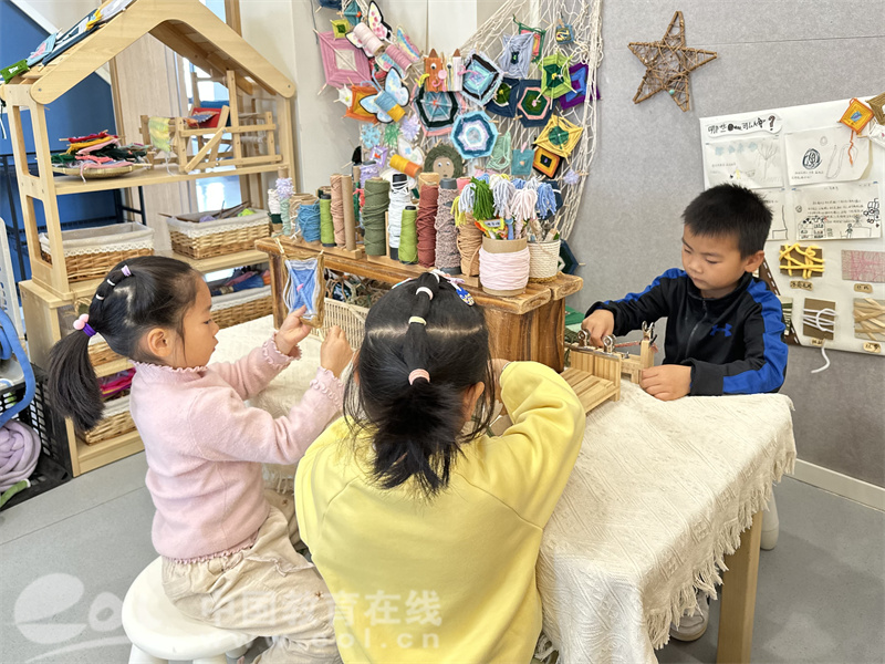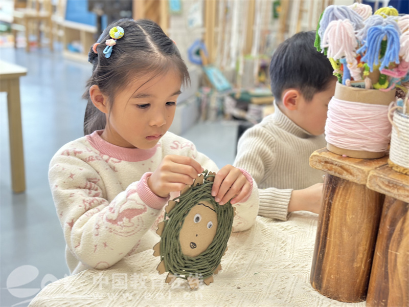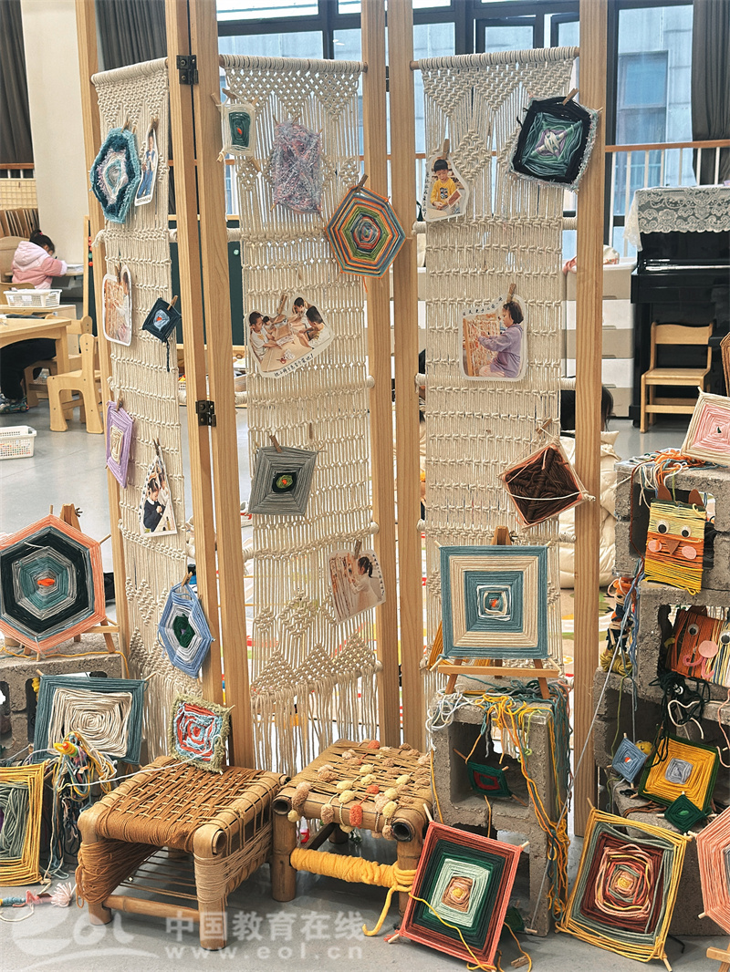 中国教育在线浙江站讯 (编辑 鲁少辛 通讯员 金蕾 程丹丹)近日,走进杭州市行知新城幼儿园你会发现走廊不再是单调的过道,而是一条“会讲故事”的编织长廊:冰岛毛线缠绕的塑料筐像披上了彩色毛衣,美拉德色棉线织的挂毯随风轻晃,连自然掉落的树枝也被孩子们用麻线绕出了年轮的温度。这里,一场名为“指尖传承”的项目化编织活动正在悄悄发生。