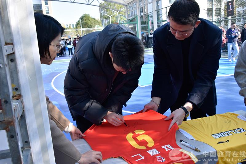 “传承时刻”接踵而至。学生代表910班王若曦、705班吴逸哲捧出精心绘制的Q版画像,笔墨间满溢崇敬。罗敏江书记、郭莹莹校长向两位嘉宾赠送文海中学专属纪念球衣。嘉宾签名后,球衣将被永久珍藏。这一赠一收,不仅是情感的传递,更是职业篮球精神与校园体育文化的庄严接力。