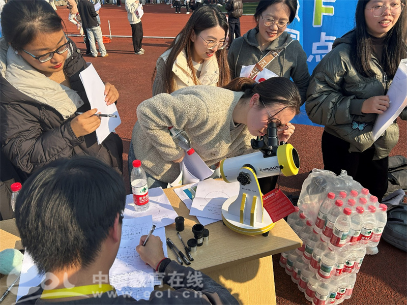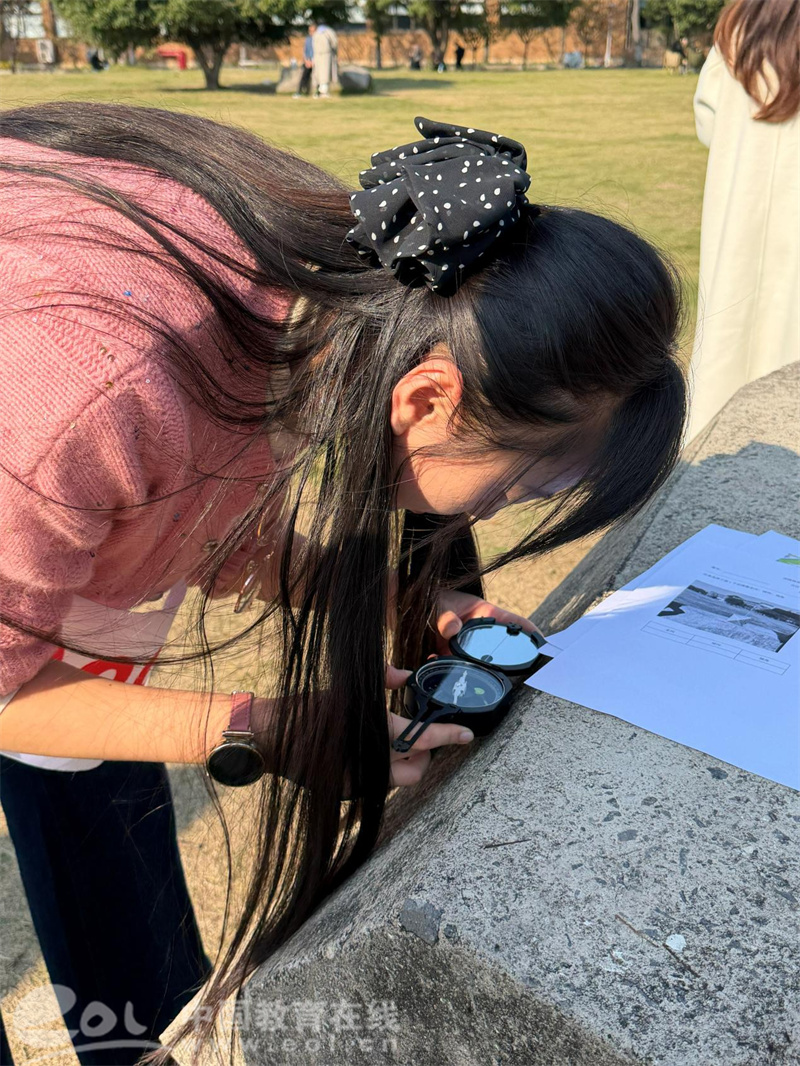 活动现场,教师们手持地图与任务卡,穿梭于校园各处。在包玉刚图书馆前,他们运用多种方法估算建筑高度;在大草坪上,认真操作罗盘测量岩石产状;在河边协作完成水位记录与水质检测;在天文观测点,通过望远镜观测太阳黑子并绘制图像。每个任务点都成为了生动的户外课堂,充分体现了“在做中学、在学中教”的培训理念。