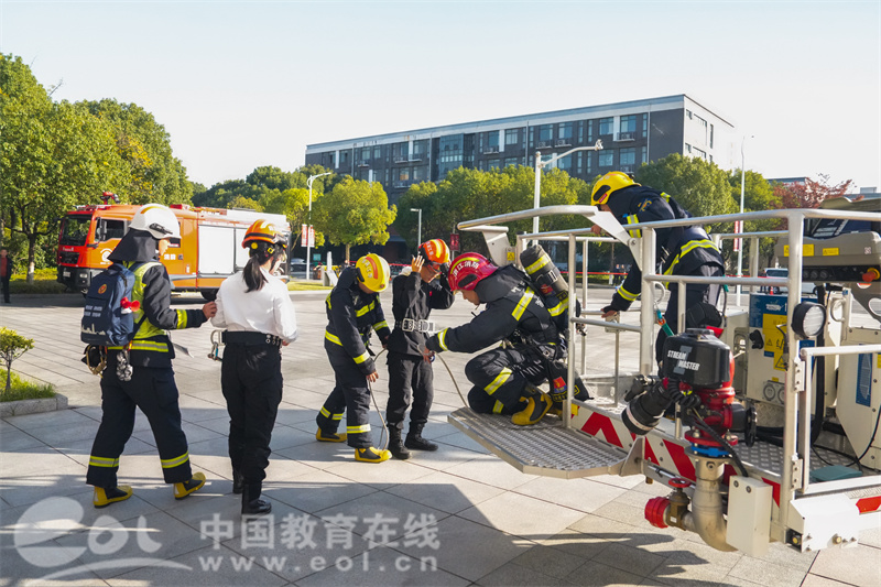 校长张宏、副校长王华峰、方泽波,绍兴市消防救援支队支队长李宿龙、副支队长丁健勇等出席活动,校党委副书记高丽静主持演练。