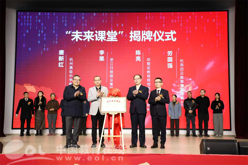 当天的重头戏,是“未来课堂”项目的正式启动。在浙江日报报业集团、拱墅区教育局、浙江大学计算机学院及多家科技企业代表的共同见证下,一块闪烁着光的牌匾被揭幕,这标志着启正中学成为区域探索AI赋能教育教学的“试验田”。