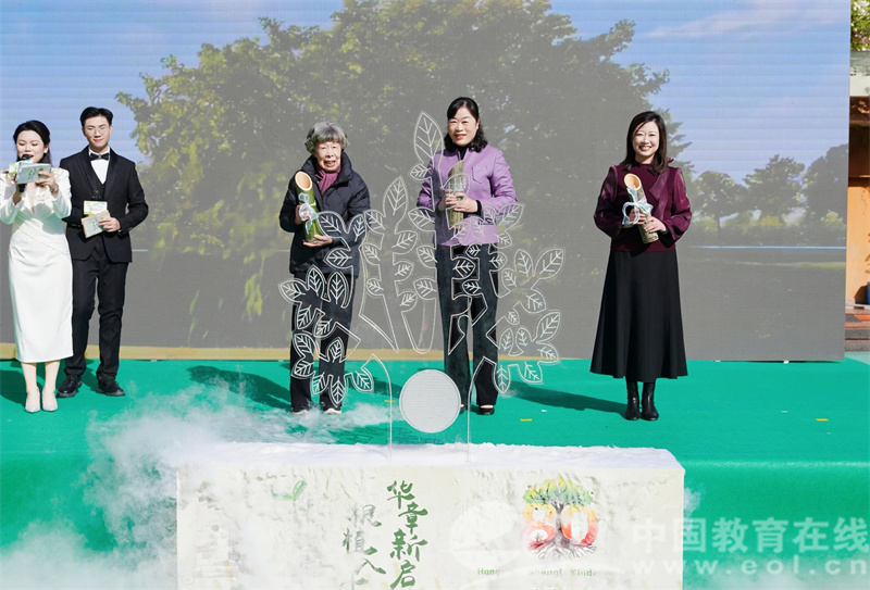 庆典的庄重时刻属于“胜利精神传承仪式”。王正、章玲敏、史曼丽几代园长依次登台,以竹简传水、汇流浇灌绿芽,象征胜利精神与教育使命的代代相承。清泉流淌,如岁月长河中的教育坚守,润泽每一颗稚嫩心灵。