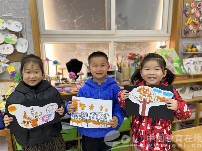 品尝过后,橘子体验活动仍在继续。大班幼儿用橘皮进行艺术创作,中班尝试橘子拓印,小班则以手指点画再现橘子形象。各类区域活动中,幼儿们晒制橘皮、种植橘籽,探索植物生命的循环;家庭中,幼儿们与爸爸妈妈共同制作橘子糖水、冰糖葫芦,将体验与操作延伸至生活日常中。