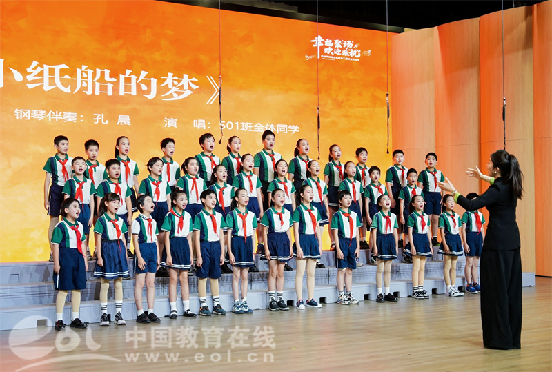 在校友文化节的美育成果汇报会上,501班全体同学演唱的《小纸船的梦》,用纯净的歌声展现了美育成果在普通班级中绽放的光芒。