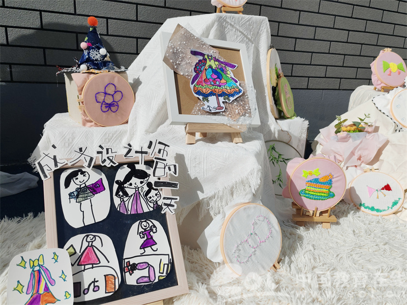 掌握基础技能后,孩子们先在纸上设计图案,再用针线将创意落地:灵动的小鱼、鲜艳的花朵、可爱的小动物,每件作品都充满童真。随着作品积累,孩子们主动提议举办“刺绣作品展”,大胆设想将操场变为露天展厅。他们全程参与讨论流程、分工备料、搭建展区,最终的作品展吸引全园幼儿驻足,成为校园里的亮丽风景。