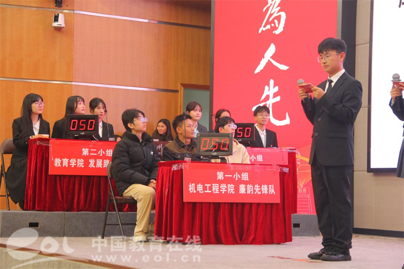 经过激烈角逐,最终获奖情况如下:一等奖获得者为机电工程学院“廉韵先锋队”;二等奖获得者为教育学院“发展路上不掉队”,人文学院“仄仄平平仄队”;三等奖获得者为法学院“廉洁智多星”,外国语学院“从容应队”,马克思主义学院“答得都队”。