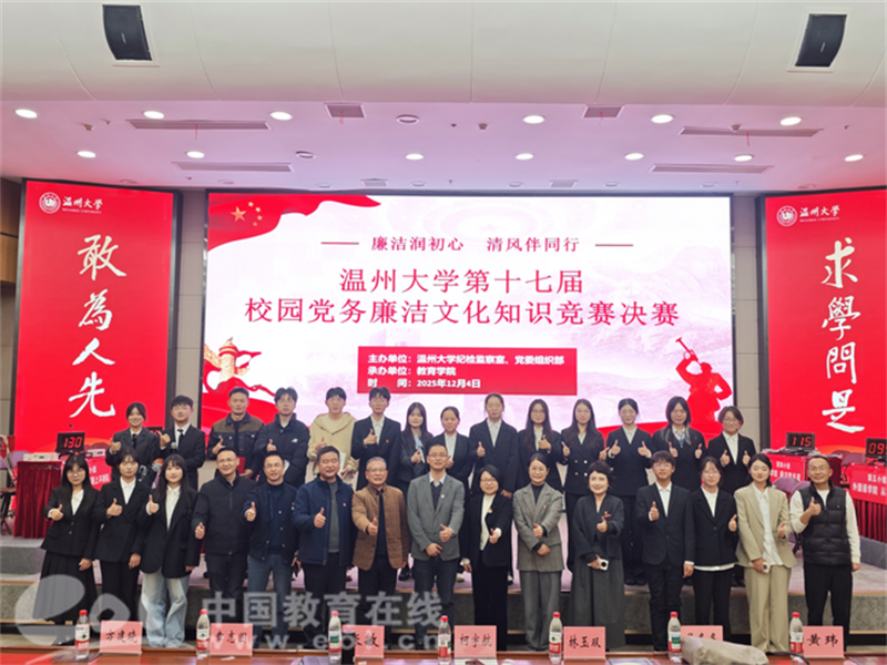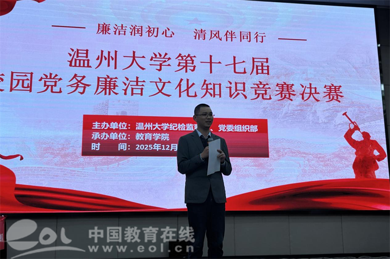中国教育在线浙江站讯 (记者 陈显婷 通讯员 侯利兵)12月4日晚,温州大学第十七届校园党务廉洁文化知识竞赛决赛在育英图书馆二楼报告厅成功举办。本次活动以“廉洁润初心,清风伴同行”为主题,由纪检监察室、党委组织部共同主办,教育学院承办。校纪检监察室副主任柯宇航、校党委组织部干部科科长林玉双、教育学院党委书记张敏,以及各参赛学院纪委书记、师生代表共同参与。